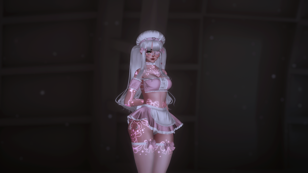 Belly piercing & Eye Texture - miriloo / Beret - foobbaby / Body - pandaabear / Body Texture & Nail Cuts - ying.vr / Bows - !Oshen#4444 / Bun hair & Choker 1 - darcy.fbx (nitro) / Top - skeletib / Pants - Nyakoh#6666 / Sneakers - sleepyvrc / Heels 1 - moobean / Earrings - holoexe / Eyelashes - sivka. , xsnail / Face Jewelry - sunnybun / Nail Gems - desipooh / Glasses - yamuvr / Hairs - saikura , nymphee , parvrc , yuurii / Head - sivka. / Heels 2 - teacakezz / Leg warmers - apyr (nitro) / Long sleeve sweater - loziloki / Onesie & Socks - rinebean / Maid Outfit - lolo3d / Pasties - Empress Moon / Paws - cow#4888 / Panties & Kitty Top - xsnail / Sock Ruffles - weeeby / Stockings by Yuuki#9669 / Icons & Tattoos 1 & 2 - maddiiee / Lollipop - nuusa / Underboob Top - meowmi / Dress - wetcat / Matcaps - minichibi / Poppable Bubblegum - cakie.exe / Deer Follower - Koragira , hfcRed / Floppy Hat - xitaberry / Combo Gestures - haï / Av3 Creator - Rafa / Gogo Loco - Franada / Sit Pose - Wetcat